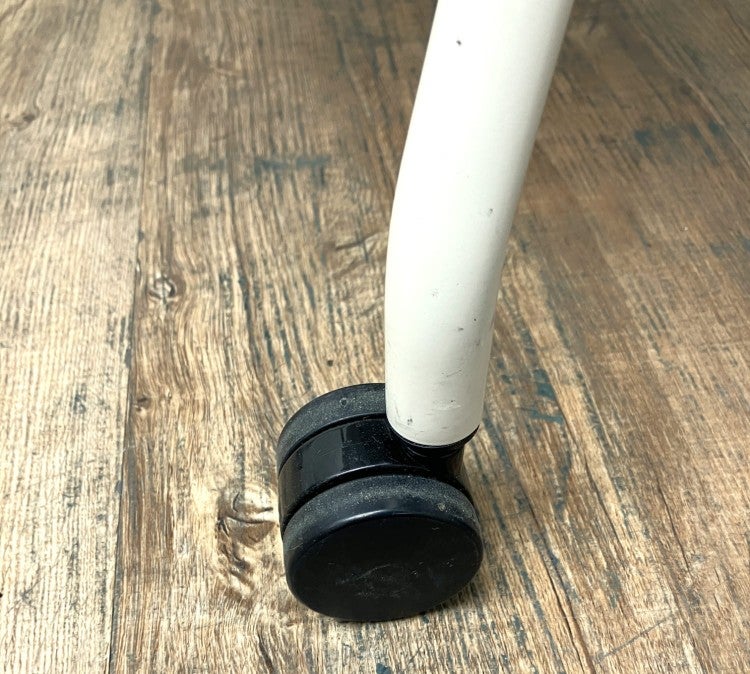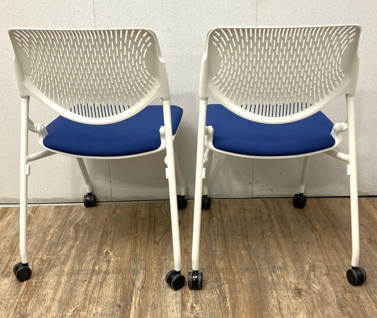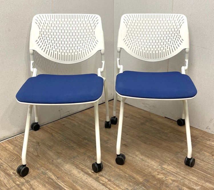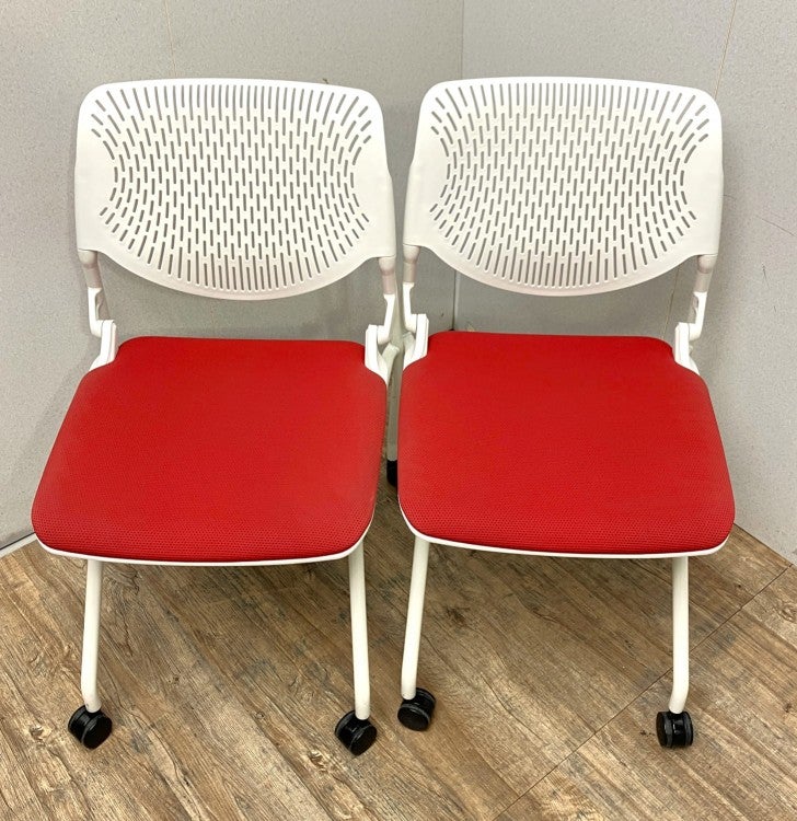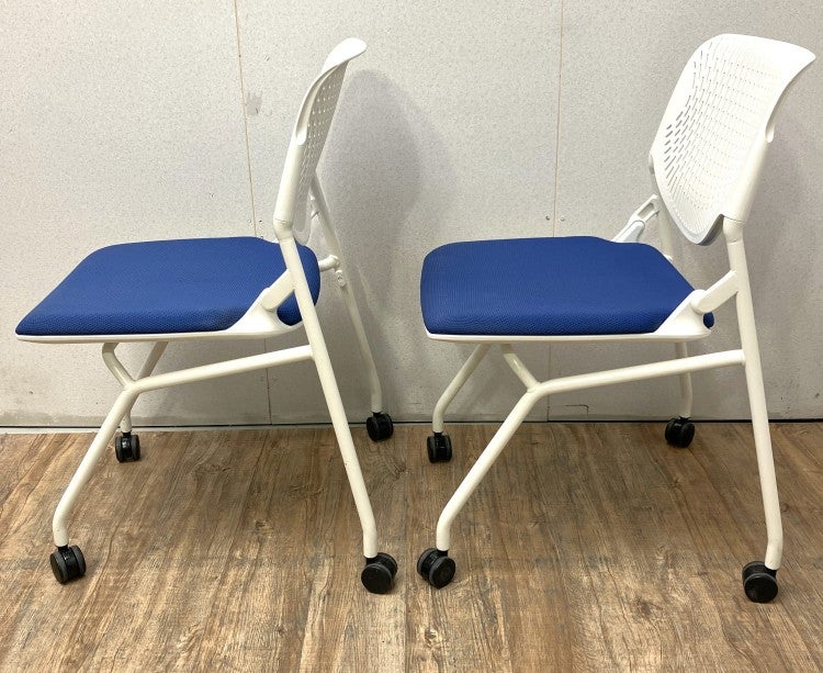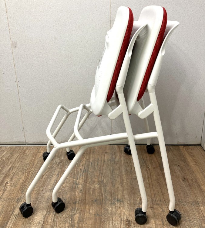 座面を跳ね上げることで、チェア同士を前後平行に重ねて収納できるキャスター付きチェアです。